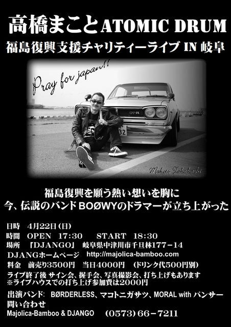 じゃ、自分のblogだし少し裏話でも? フライヤーは岐阜・中津川での公演分 MφRALのmanasanにチケット販売のお話を頂戴して 自分流に販売活動をさせて頂いてました。 あのBOOWYの高橋まことさんの公式チケットですよ! 光栄ですよね! 余りに一生懸命になりすぎて、少々手荒くなりましたが?(^_^;) 日にちも無かった分、焦りました(^_^;) MφRALの方々にはご迷惑をお掛けしたかも? m(_ _;)m 私から買って頂いた人からは大変喜んで頂き それはそれは、現地に行ってない私も大変嬉しかったです! これって、自分たちでチケット売って、 自分たちを見に来てくれたお客様が目の前で喜んでくれてって、 そんな体験出来て羨ましいな?て思ってみたり。 布袋さんのライヴ好きもそういう事かな?(笑) 大変貴重な体験が出来て良かったな♪とmanasanに感謝しつつ… まことさんの活動をネットで追い掛けていると、 ひょんなところからまたお話が舞い込んで来た!(・・;) 本日、まことさんのblogで発表になった 復興支援ライヴの 栃木 と 大阪 のバンド関係者からPRのお手伝いオファーが?(・・;)(笑) あんなんでいいのか?(^_^;)(笑) と言うか、 またまことさんのお手伝いが出来る事に感謝! やはり私もBOOWYからは離れられない。 BOOWYがあってこその布袋寅泰。 そんな皆さんとの繋がりに日々感謝。 PR