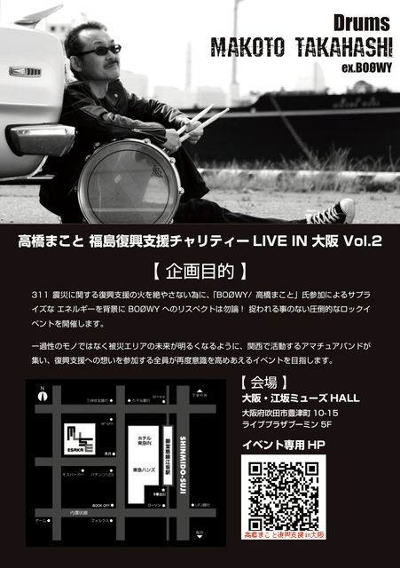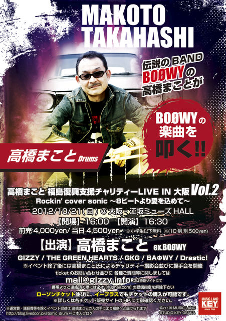 高橋まこと:福島復興支援チャリティーLIVE IN 大阪 vol.2 GIZZY present's Rockin' cover sonic ~8ビートより愛を込めて~ SECOND STAGE~ 前回4/21に紡いだ熱い絆の 高まりを更なる復興支援の灯火に!! 2012/10/21(日) 大阪編の第二弾がついに決定! 福島復興支援を掲げ全国各地へと 精力的に活動するその想いと行動力への 共感と共鳴が重なり!スペシャルゲストとして ”高橋まこと”氏が大阪は江坂MUSEに登場!! 今宵限りの強力なサポートメンバーと共にBOΦWY時代の 楽曲で組まれたSET LISTで激レアなLIVEをお届けします。 Rockin' cover sonic ~8BEATより愛をこめて~ この貴重な夜、全国のBOΦWYファンのみならず 時代を愛した全てのロックファンの魂を一つに... そして ”がんばっぺ!福島。” LIVE終了後にチャリティーサイン会を実施致します。 本イベント収益の一部を福島県復興支援の義援金として、 高橋まことさんご本人が故郷である福島へ持って行きます。 ”ALL FOR ONE,ONE FOR ALL” ☆日時 2012年10月21日(日) 16:00OPEN/16:30START ☆ACT GIZZY/BAΦWY/Drastic!/ THE GREEN HEARTS/GKG Special Guest:高橋まことBAND ☆チケット価格(前売/当日) ※小学生以下無料 ¥4,000/¥4,500 ☆ドリンク代 1drink ¥500 ☆会場 江坂MUSE HALL 〒564-0051 大阪府吹田市豊津町10-15 ライブプラザブーミン5F ☆ご予約・お問い合わせ 当HPのCONTACTより全てメールにて対応となります。 ※江坂MUSEホールへはお電話でのticketの御予約等 お問い合わせ頂いても対応致しかねますのでご了承下さい ※私、HOTEI ANGEL管理人 yuri と友人、GIZZY 八神灰児氏を お手伝いをさせて頂くことになりました~(・o・)ノ 皆様、1人でも多くの方々にご賛同頂ける様、ご協力ご支援宜しくお願い致します! 10/21高橋まこと福島復興支援vol.2 チャリティーLIVE in 大阪の詳細は↓ [特設サイト] http://boowy-takahashi0421.jimdo.com [ticket予約フォーム] https://ssl.form-mailer.jp/fms/61f7e3d1103506 ticket購入は上記 予約フォームからでも LAWSONチケット& eプラスでもOKです! PR