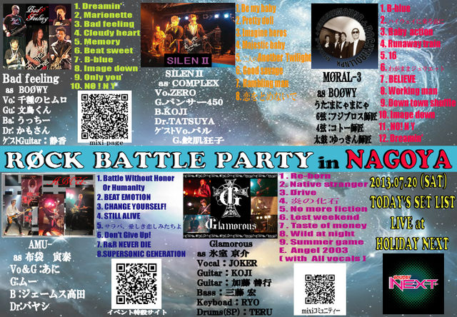 「RφCK BATTLE PARTY IN NAGOYA」 『MφRAL-3』と同じイベントに対バンとして『アムー』も出演しました。 Vo&Gu あに Gu ムー Ba ジェームス高田 Dr バヤシ 「アムー」は私の布袋コピーでは一推し(笑) 結成当初から「アムー」の映像は拝見させて頂いてますが この名古屋は凄く盛り上がったみたいですね。 初出し曲も数曲。 つか、このセトリムッチャ良くて!! 特に、「サラバ、愛しき悲しみたちよ演るかっ!!」と興奮してしまいました(笑) ご本人「俺のキーではかなりキツイんです」と仰っていましたが あのももクロのキーは女性でもかなりキツイです。 キー落としても難しいでしょうね。 でもそんなのおかまいナシで会場は大盛り上がり! と言うのも、私、初めてステージからの映像と言うのを見ました。 普通の映像を見ていたらお解かりかと思いますが 「サラバ、愛しき悲しみたちよ」で誰かステージに乱入しているんですよw 「誰だよ!」と、思いっきりツッコミ入れながらよく見てみると、 パンサー450氏ではないかっ!!ww 主催者特権ですね?(笑).ww 私的には「邪魔するなよ!w」だったんですが、映像上がって来てびっくり!! これがまたムッチャイイ!!(笑) つか、ムー氏が途中、演奏放棄して踊り出してます(笑) こんなムー氏観るの初めて!(笑) いかに楽しかったか?(笑) 演奏に関しては流石アムーです。 映像、お借りして来てますので、観ていただいた方が早いかな? 再生リストで一挙公開してます。 『アムー RφCK BATTLE PARTY IN NAGOYA』 Battle Without Honer Or Humanity BEAT EMOTION CHANGE YOURSELF! STILL ALIVE サラバ、愛しき悲しみたちよ Don't Give Up! R&R NEVER DIE SUPER SONIC GENERATION こちらのアムーをご覧になりたい方は 次回のライヴが決定していますのでお知らせします。 Rock'nRoll Survival Vol,4 -20century boys vs girls- (J -POPコピーオンリーイベント) 両国SUNRISE 8/24(sat) open16:00 start16:30 ticket\1500 出演バンド SUPER GENERATION:水樹奈々コピバン(16:30~) MONOTONE:GLAYコピバン(17:15~) C's case:coccoコピバン(18:00~) Beat haze:氷室コピバン(18:45~) プッチンプリンセス:プリプリコピバン(19:30~) アムー:布袋コピバン(20:15~) 以上6バンドで、女性と男性ボーカルのバンドが交互に出ます。 ご本人、年末年始は埼玉と新宿LOFTで埼京ツアーでしたが、 今回は名古屋と両国で東名ツアーと仰っています(笑) お時間のある方は是非! 一見の価値ありです♪ PR